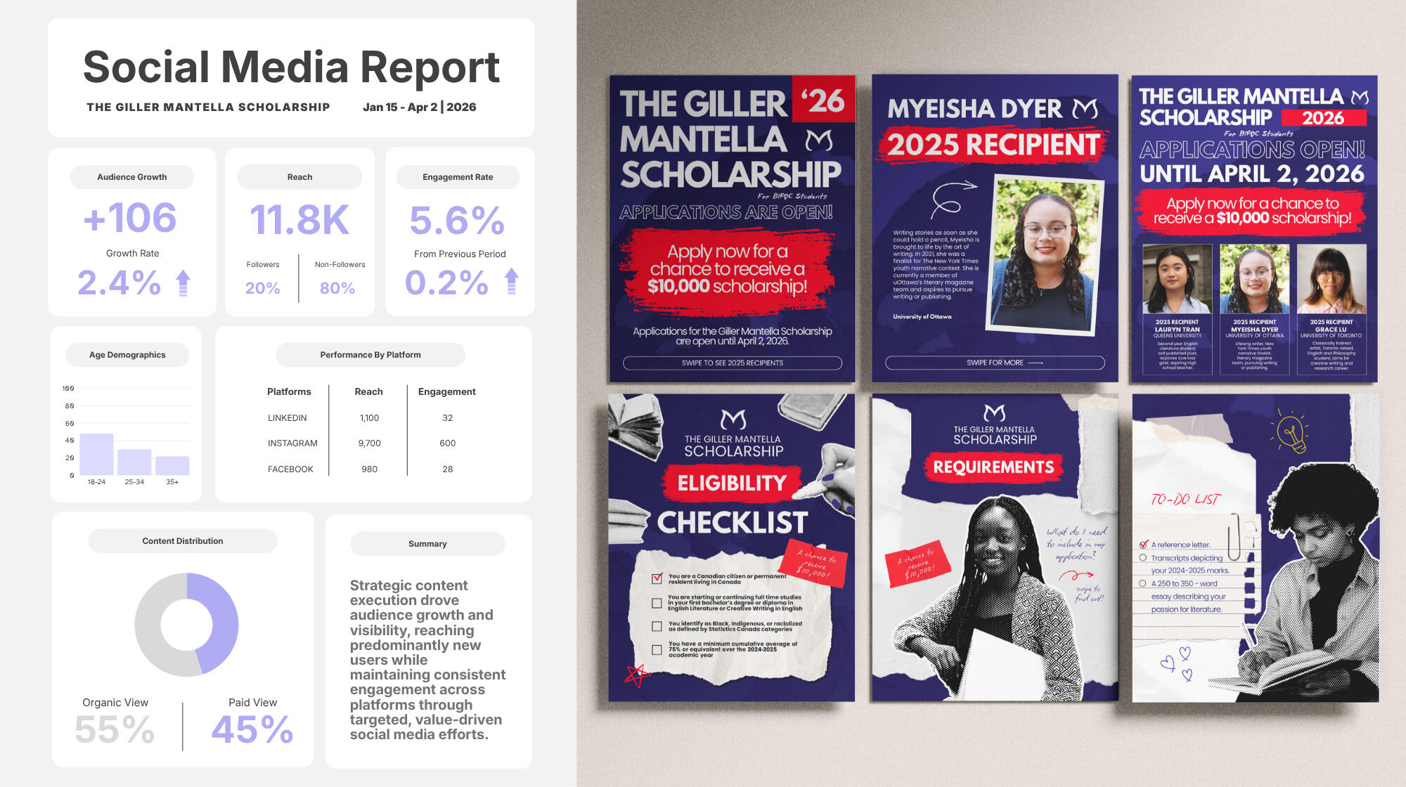 The Giller Mantella Scholarship supports BIPOC student writers; brand development included logo design, visual identity, and social media strategy to build awareness and engagement.