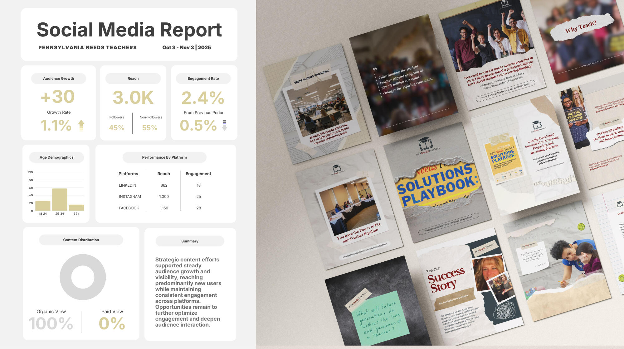 Pennsylvania Needs Teachers promotes education careers and highlights teaching challenges; brand development included social media management, strategy, and cohesive visual identity.