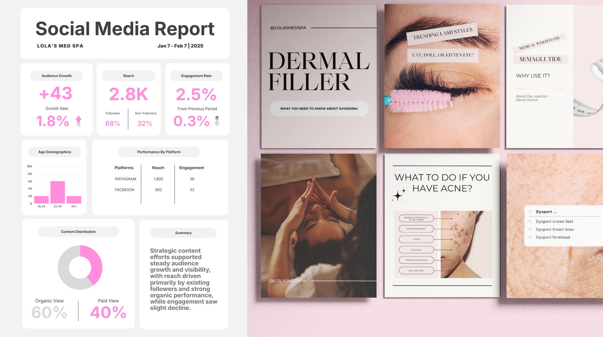 Lola’s Med Spa offers cosmetic enhancements and aesthetic treatments; brand development included social media management, strategy, and cohesive visual identity to educate audiences on services.