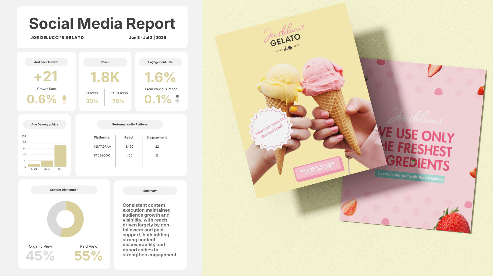 Joe Delucci’s Gelato highlights premium flavors and product quality; content focused on B2B audiences through social media strategy, management, and visually engaging brand presence.