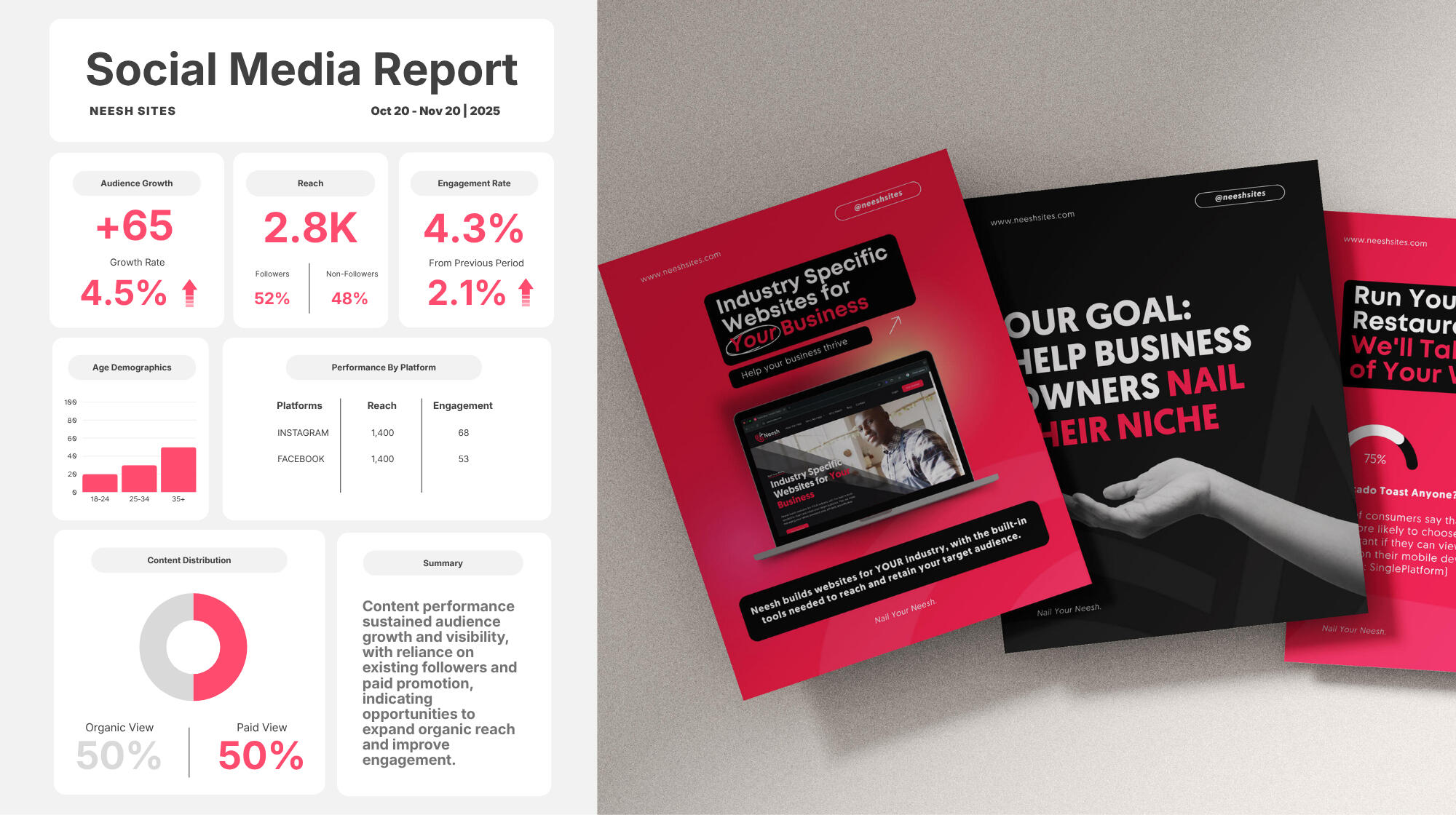 Neesh Sites creates tailored websites for niche businesses; social media management included strategy, content planning, and cohesive visuals to showcase services and drive engagement.